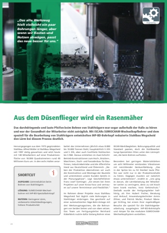 Aus dem D%u00fcsenflieger wird ein Rasenm%u00e4her Hervorgegangen aus dem 1973 gegr%u00fcndeten Stahlbau Alfred M%u00fcller ist Stahlbau Wegscheidseit 1997 stetig gewachsen und setzt heute mit 140 Mitarbeitern auf einer Produktionsfl%u00e4che von 18.000 Quadratmetern rund 40 Millionen Euro um. In den sechs Hallen verarbeitet das Unternehmen j%u00e4hrlich etwa 8.000 bis 10.000 Tonnen Stahl, haupts%u00e4chlich S 235 und S 355, aber auch hochfeste Stahlsorten bis S 960. Daraus entstehen im Zwei-SchichtBetrieb Konstruktionen zum Hoch-, Br%u00fccken-, Maschinen-, Dach- und Fassadenbau f%u00fcr Baufirmen, Industriebetriebe und die %u00f6ffentliche Hand aus Deutschland und %u00d6sterreich. %u201eNeben der Produktion %u00fcbernehmen wir auch die Konstruktion und Montage der Bauteile und unterst%u00fctzen unsere Kunden bereits in der Planungsphase%u201c, sagt Gesch%u00e4ftsf%u00fchrer Franz Josef Gottinger. %u201eSie setzen bei ihren Projekten auf unser Know-how und vertrauen auf unsere Termintreue und Flexibilit%u00e4t.%u201cIm Rahmen dieser Projekte muss StahlbauWegscheid fast t%u00e4glich viele Bohrungen in Stahltr%u00e4ger einbringen. Das geschieht auf einer automatisierten S%u00e4ge-Bohr-Anlage mit drei Werkzeugmagazinen, die die Bohrungen von beiden Seiten und von oben setzen.Das Team um Fertigungsleiter Reinhard K%u00fcbelb%u00f6ck nutzte daf%u00fcr bislang Bohrer eines ISCAR-Marktbegleiters. Bohrungsqualit%u00e4t und Standzeit passten, doch die Stahlbearbeitungs-Spezialisten litten unter den L%u00e4rmspitzen, die beim Bohren auftraten.Besonders bei geringen Materialst%u00e4rken um acht Millimeter entstanden Vibrationen mit nervt%u00f6tender Ger%u00e4uschbildung. %u201eDas in der Spitze bis zu 92 Dezibel laute Pfeifen war nicht nur in der Produktionshalle zu h%u00f6ren. Dagegen mussten wir nat%u00fcrlich etwas unternehmen%u201c, erz%u00e4hlt er. %u201eUns ging es darum, die L%u00e4rmbelastung der Mitarbeiter weiter zu verringern, denn zu viel Krach kann krank machen, trotz Geh%u00f6rschutz.%u201c Deshalb wurde der Fertigungsleiter hellh%u00f6rig, als ihm Hubert Fischer, Beratung und Verkauf, Anwendungstechniker Armin Zillner, und Patrick Muller, Product Manager Drilling, bei einem ihrer regelm%u00e4%u00dfigen Besuche die speziell f%u00fcr die Stahltr%u00e4gerbearbeitung ausgelegten IHP-BD-Bohrk%u00f6pfe und -k%u00f6rper f%u00fcr das modulare SUMOCHAMWechselkopfsystem vorstellten.Das durchdringende und laute Pfeifen beim Bohren von Stahltr%u00e4gern war sogar au%u00dferhalb der Halle zu h%u00f6ren und war der Gesundheit der Mitarbeiter nicht zutr%u00e4glich. Mit ISCARs SUMOCHAM-Wechselkopfbohrer und dem speziell f%u00fcr die Bearbeitung von Stahltr%u00e4gern entwickelten IHP-BD-Bohrkopf reduzierte Stahlbau Wegscheid den L%u00e4rm bei diesem Prozess deutlich.%u201eDas alte Werkzeug hielt vielleicht ein paar Bohrungen l%u00e4nger, aber wenn wir Kosten und Nutzen abw%u00e4gen, passt das neue besser f%u00fcr uns.%u201cSHORTCUTAUFGABE: L%u00e4rmreduktion beim Bohren von Stahltr%u00e4gern L%u00d6SUNG: SUMOCHAM-Wechselbohrer mit IHP-BD-Spezialbohrkopf NUTZEN: Geringerer L%u00e4rm, verbesserte Arbeitsbedingungen, h%u00f6here Produktivit%u00e4ti28