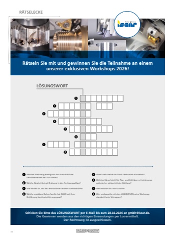 R%u00c4TSELECKER%u00e4tseln Sie mit und gewinnen Sie die Teilnahme an einem unserer exklusiven Workshops 2026!Schicken Sie bitte das L%u00d6SUNGSWORT per E-Mail bis zum 28.02.2026 an [email protected]. Die Gewinner werden aus den richtigen Einsendungen per Los ermittelt.Der Rechtsweg ist ausgeschlossen.L%u00d6SUNGSWORT312568741 Welches Werkzeug erm%u00f6glicht das wirtschaftliche Gewindestechen bei AVS R%u00f6mer? 2 Welche Neuheit bringt Ordnung in den Fertigungsalltag?3 Wie hei%u00dfen ISCARs neu entwickelte Keramik-Schneidstoffe? 4 Welche modulare Bohrerfamilie hat ISCAR seit ihrer Einf%u00fchrung kontinuierlich angepasst? 5 Womit reduzierte das Stork-Team seine R%u00fcstzeiten? 6 Welches K%u00fcrzel steht f%u00fcr Plan- und Eckfr%u00e4ser mit str%u00f6mungsoptimierter, zielgerichteter K%u00fchlung?7 Wer entwarf die Titan-Gitarre? 8 Wer verdoppelte mit dem LOGIQ6TURN seine Werkzeugstandzeit beim Schruppen?66