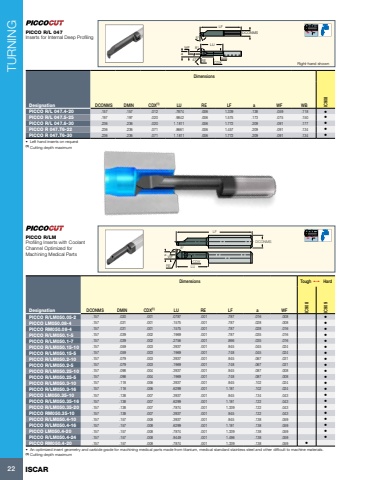 TURNING22 ISCAR5%u00b047%u00b0a8%u00b0WBLFRE CDXWFDCONMSLURight-hand shownDimensionsDesignation DCONMS DMIN CDX(1) LU RE LF a WF WB IC908PICCO R/L 047.4-20 .157 .157 .012 .7874 .006 1.339 .138 .059 .118 %u2022 PICCO R/L 047.5-25 .197 .197 .020 .9842 .006 1.575 .173 .075 .150 %u2022 PICCO R/L 047.6-30 .236 .236 .020 1.1811 .006 1.772 .209 .091 .177 %u2022 PICCO R 047.T6-22 .236 .236 .071 .8661 .006 1.457 .209 .091 .134 %u2022 PICCO R 047.T6-30 .236 .236 .071 1.1811 .006 1.772 .209 .091 .134 %u2022 %u2022 Left hand inserts on request(1) Cutting depth maximum PICCO R/L 047Inserts for Internal Deep ProfilingLFLUCDXWFREa8%u00b0DCONMSDimensions Tough 1 HardDesignation DCONMS DMIN CDX(1) LU RE LF a WF IC908 IC909PICCO R/LM050.05-2 .157 .020 .001 .0787 .001 .787 .016 .008 %u2022 PICCO LM050.08-4 .157 .031 .001 .1575 .001 .787 .028 .008 %u2022 PICCO RM050.08-4 .157 .031 .001 .1575 .001 .787 .028 .016 %u2022 PICCO R/LM050.1-5 .157 .039 .002 .1969 .001 .787 .035 .016 %u2022 PICCO R/LM050.1-7 .157 .039 .002 .2756 .001 .866 .035 .016 %u2022 PICCO R/LM050.15-10 .157 .059 .003 .3937 .001 .945 .045 .024 %u2022 PICCO R/LM050.15-5 .157 .059 .003 .1969 .001 .748 .045 .024 %u2022 PICCO R/LM050.2-10 .157 .079 .003 .3937 .001 .945 .067 .031 %u2022 PICCO R/LM050.2-5 .157 .079 .003 .1969 .001 .748 .067 .031 %u2022 PICCO R/LM050.25-10 .157 .098 .004 .3937 .001 .945 .087 .008 %u2022 PICCO R/LM050.25-5 .157 .098 .004 .1969 .001 .748 .087 .008 %u2022 PICCO R/LM050.3-10 .157 .118 .006 .3937 .001 .945 .102 .024 %u2022 PICCO R/LM050.3-16 .157 .118 .006 .6299 .001 1.181 .102 .024 %u2022 PICCO LM050.35-10 .157 .138 .007 .3937 .001 .945 .134 .043 %u2022 PICCO R/LM050.35-16 .157 .138 .007 .6299 .001 1.181 .122 .043 %u2022 PICCO R/LM050.35-20 .157 .138 .007 .7874 .001 1.339 .122 .043 %u2022 PICCO RM050.35-10 .157 .138 .007 .3937 .001 .945 .122 .043 %u2022 PICCO R/LM050.4-10 .157 .157 .008 .3937 .001 .945 .138 .059 %u2022 PICCO R/LM050.4-16 .157 .157 .008 .6299 .001 1.181 .138 .059 %u2022 PICCO LM050.4-20 .157 .157 .008 .7874 .001 1.339 .138 .059 %u2022 PICCO R/LM050.4-24 .157 .157 .008 .9449 .001 1.496 .138 .059 %u2022 PICCO RM050.4-20 .157 .157 .008 .7874 .001 1.339 .138 .059 %u2022 %u2022 An optimized insert geometry and carbide grade for machining medical parts made from titanium, medical standard stainless steel and other difficult to machine materials.(1) Cutting depth maximum PICCO R/LMProfiling Inserts with Coolant Channel Optimized for Machining Medical Parts