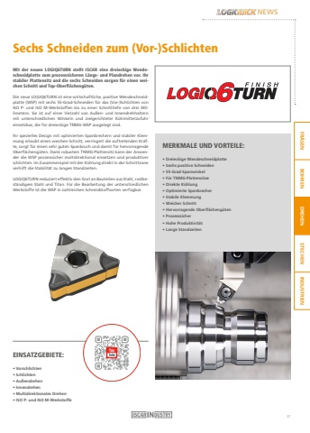 FR%u00c4SEN BOHREN DREHEN STECHEN INDUSTRIENNEWSMit der neuen LOGIQ6TURN stellt ISCAR eine dreieckige Wendeschneidplatte zum prozesssicheren L%u00e4ngs- und Plandrehen vor. Ihr stabiler Plattensitz und die sechs Schneiden sorgen f%u00fcr einen weichen Schnitt und Top-Oberfl%u00e4cheng%u00fcten.Die neue LOGIQ6TURN ist eine wirtschaftliche, positive Wendeschneidplatte (WSP) mit sechs 55-Grad-Schneiden f%u00fcr das (Vor-)Schlichten von ISO P- und ISO M-Werkstoffen bis zu einer Schnitttiefe von drei Millimetern. Sie ist auf einer Vielzahl von Au%u00dfen- und Innendrehhaltern mit unterschiedlichen Winkeln und zielgerichteter K%u00fchlmittelzufuhr einsetzbar, die f%u00fcr dreieckige TNMG-WSP ausgelegt sind.Ihr spezielles Design mit optimierten Spanbrechern und stabiler Klemmung erlaubt einen weichen Schnitt, verringert die auftretenden Kr%u00e4fte, sorgt f%u00fcr einen sehr guten Spanbruch und damit f%u00fcr hervorragende Oberfl%u00e4cheng%u00fcten. Dank robustem TNMG-Plattensitz kann der Anwender die WSP prozesssicher multidirektional einsetzen und produktiver schlichten. Im Zusammenspiel mit der K%u00fchlung direkt in der Schnittzone verhilft die Stabilit%u00e4t zu langen Standzeiten.LOGIQ6TURN reduziert effektiv den Grat an Bauteilen aus Stahl, rostbest%u00e4ndigem Stahl und Titan. F%u00fcr die Bearbeitung der unterschiedlichen Werkstoffe ist die WSP in zahlreichen Schneidstoffsorten verf%u00fcgbar.Sechs Schneiden zum (Vor-)Schlichten MERKMALE UND VORTEILE:%u2022 Dreieckige Wendeschneidplatte %u2022 Sechs positive Schneiden%u2022 55-Grad-Spanwinkel%u2022 F%u00fcr TNMG-Plattensitze%u2022 Direkte K%u00fchlung%u2022 Optimierte Spanbrecher %u2022 Stabile Klemmung %u2022 Weicher Schnitt%u2022 Hervorragende Oberfl%u00e4cheng%u00fcten%u2022 Prozesssicher %u2022 Hohe Produktivit%u00e4t %u2022 Lange StandzeitenEINSATZGEBIETE:%u2022 Vorschlichten%u2022 Schlichten%u2022 Au%u00dfendrehen%u2022 Innendrehen%u2022 Multidirektionales Drehen%u2022 ISO P- und ISO M-Werkstoffe37