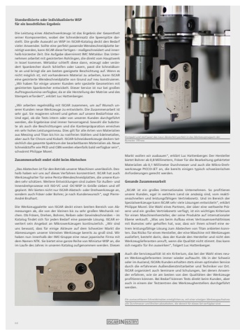 Standardisierte oder individualisierte WSP f%u00fcr ein beachtliches ErgebnisDie Leistung eines Abstechwerkzeugs ist das Ergebnis der Gesamtheit seiner Komponenten, wobei der Schneideinsatz die Speerspitze darstellt. Die gro%u00dfe Auswahl an WSP im ISCAR-Katalog deckt den Bedarf vieler Anwender. Sollte eine perfekt passende Wendeschneidplatte ben%u00f6tigt werden, kann ISCAR diese fertigen %u2013 ma%u00dfgeschneidert und innerhalb k%u00fcrzester Zeit. Die Aufgabe %u00fcbernimmt IMC M%u00e9taldur. Das Unternehmen arbeitet mit gesinterten Rohlingen, die direkt vom Hauptwerk in Israel kommen. M%u00e9taldur schleift diese dann, erzeugt oder ver%u00e4ndert Spanbrecher durch Schleifen oder Lasern, passt die Schneidkante an und bringt die am besten geeignete Beschichtung auf. Wenn es nicht m%u00f6glich ist, mit vorhandenem Material zu arbeiten, kann ISCAR eine gesinterte Wendeschneidplatte von Grund auf neu konstruieren.%u201eWir haben f%u00fcr einige unserer Kunden sehr spezielle Geometrien mit gesinterten Spanbrecher entwickelt. Dieser Service ist nur bei gro%u00dfen Auftragsvolumina verf%u00fcgbar, da er die Herstellung der Matrize und des Stempels erfordert%u201c, erkl%u00e4rt Luc Hattenberger.%u201eWir arbeiten regelm%u00e4%u00dfig mit ISCAR zusammen, um auf Wunsch unserer Kunden neue Werkzeuge zu entwickeln. Die Zusammenarbeit ist sehr gut. Sie reagieren schnell und gehen auf unsere Bed%u00fcrfnisse ein.Und egal, ob die Tests intern oder von unseren Kunden durchgef%u00fchrt werden, die Ergebnisse sind immer hervorragend. Sowohl die Substrate als auch die Beschichtungen und die Kantenpr%u00e4paration erreichen ein sehr hohes Leistungsniveau. Dies gilt f%u00fcr alle Arten von Materialien aus Messing und Titan bis hin zu rostfreien St%u00e4hlen und Edelmetallen, aber auch f%u00fcr Chrom und Kobalt. ISCAR-Schneidwerkzeuge decken tats%u00e4chlich das gesamte Spektrum der bearbeitbaren Materialien ab. Neue Schneidstoffe wie PKD und CBN werden ebenfalls bald verf%u00fcgbar sein%u201c, schw%u00e4rmt Philippe Morel.Zusammenarbeit endet nicht beim Abstechen %u201eDas Abstechen ist f%u00fcr den Betrieb unserer Maschinen unerl%u00e4sslich. Deshalb haben wir uns auf dieses Verfahren konzentriert. ISCAR hat auch Werkzeughalter f%u00fcr seine Penta-Wendeschneidplatten, die unsere Kunden sehr sch%u00e4tzen. Weitere Entwicklungen sind zudem f%u00fcr Au%u00dfen- und Innendrehprozesse mit ISO-VC und -DC-WSP in Gr%u00f6%u00dfe sieben und elf geplant. Wir bieten nicht nur ISCAR-Abstech- oder Drehwerkzeuge an, sondern auch Fr%u00e4ser oder Bohrer, je nach Kundenwunsch%u201c, sagt PierreAndr%u00e9 Brulhart.Die Werkzeugpalette von ISCAR deckt einen breiten Bereich von Abmessungen ab, die von der kleinen bis zu sehr gro%u00dfen Mechanik reichen. Ob Fr%u00e4sen, Drehen, Bohren, Reiben oder Gewindeschneiden %u2013 im Katalog findet sich f%u00fcr jeden Bedarf eine passende L%u00f6sung. ISCAR erweitert sein Angebot an Mikrowerkzeugen kontinuierlich. %u201eWir sind uns bewusst, dass f%u00fcr einige Akteure auf dem Schweizer Markt die Abmessungen unserer kleinsten Werkzeuge bereits zu gro%u00df sind. Wir haben nun innerhalb der IMC-Gruppe eine neue japanische Firma mit dem Namen NTK. Sie bietet eine ganze Reihe von Miniatur-WSP an, die im Laufe des Jahres in unseren Katalog aufgenommen werden. Diesen Markt wollen wir ausbauen%u201c, erkl%u00e4rt Luc Hattenberger. Der Hersteller bietet Bohrer ab 0,8 Millimetern, Fr%u00e4ser f%u00fcr die Bearbeitung geh%u00e4rteter Materialien ab 0,1 Millimeter Durchmesser und auch die Mikro-Drehwerkzeuge PICCO-JET an, die bereits einigen typisch schweizerischen Anforderungen gerecht werden.Gesunde Zusammenarbeit %u201eISCAR ist ein gro%u00dfes internationales Unternehmen. So profitieren unsere Kunden, egal in welchem Land sie ans%u00e4ssig sind, vom reaktionsschnellen und leistungsf%u00e4higen Vertriebsnetz. Und im Bereich der Spezialwerkzeuge kann ISCAR sehr viele L%u00f6sungen entwickeln%u201c, erkl%u00e4rt Philippe Morel. Die Wahl eines Partners, der %u00fcber eine weltweite Pr%u00e4senz und ein gro%u00dfes Vertriebsnetz verf%u00fcgt, ist ein wichtiges Kriterium f%u00fcr einen Maschinenhersteller, der seine Produkte auf internationaler Ebene verkauft. %u201eWas uns beim Aufbau eines Vertrauensverh%u00e4ltnisses mit Bumotec sehr geholfen hat, war, dass wir ihnen schnell eine extrem leistungsf%u00e4hige L%u00f6sung zum Abstechen von Titan anbieten konnten. Das Risiko f%u00fcr einen Hersteller, der eine Maschine mit Werkzeugen ausliefert, besteht darin, dass der Kunde den Hersteller und nicht den Werkzeuglieferanten anruft, wenn die Qualit%u00e4t nicht stimmt. Das kann sich negativ f%u00fcr ihn auswirken%u201c, folgert Luc Hattenberger.Auch die Servicequalit%u00e4t ist ein Kriterium, das bei der Wahl eines neuen Werkzeuglieferanten immer wieder auftaucht. Ob in der Schweiz oder im Ausland, ISCARs Kunden erhalten stets einen optimalen Service durch die erfahrenen Au%u00dfendienstmitarbeiter und Techniker vor Ort.ISCAR organisiert auch Seminare und Schulungen, bei denen Anwender erfahren, wie sie am besten von den Qualit%u00e4ten der Werkzeuge profitieren k%u00f6nnen. Bei Bedarf k%u00f6nnen Tests direkt beim Kunden, aber auch in einem der Testzentren des Werkzeugherstellers durchgef%u00fchrt werden.Kompakt und steif passt das neue Abstechkit perfekt in das Werkzeugmagazin der Bumotec 191neo.Die austauschbaren Schneideins%u00e4tze erm%u00f6glichen es, mit einer einzigen Werkzeugaufnahmealle Durchmesser und Breiten abzudecken, die derzeit f%u00fcr dieses Set verf%u00fcgbar sind.64