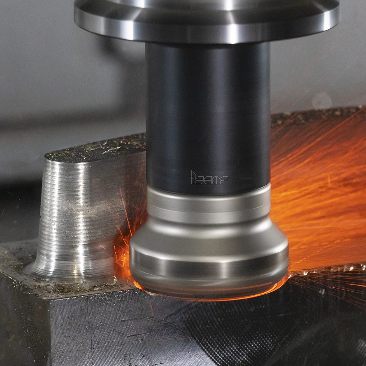 [Fig. 2- – Machining a femoral knee implant component with a MULTI-MASTER endmill and exchangeable taper barrel head.]